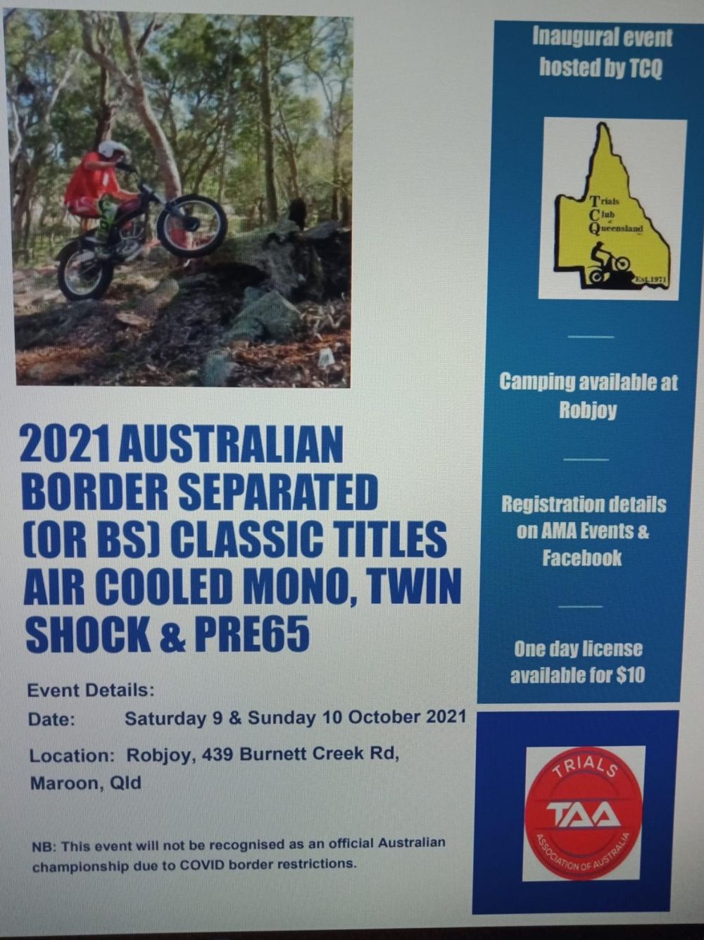 Because of the current Covid situation, this event will not be classed as an AMA Australian Championships. The event will now be referred to as the 2021 Australian Border Separated (BS) Classic Titles... This will be for 2 lines for Pre 65, Twinshock and Air Cooled Monoshock.